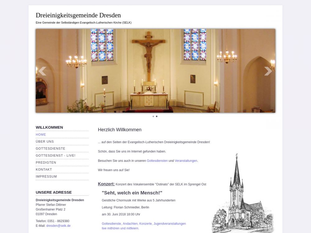 Die Evangelisch - Lutherische Dreieinigkeitsgemeinde Dresden feiert sonntäglich liturgische Gottesdienste in Form der lutherischen Messe mit der biblischen Botschaft der Rettung des Sünders allein aus Gnade, allein um Christi willen, allein im Glauben.Gemeinde-Info