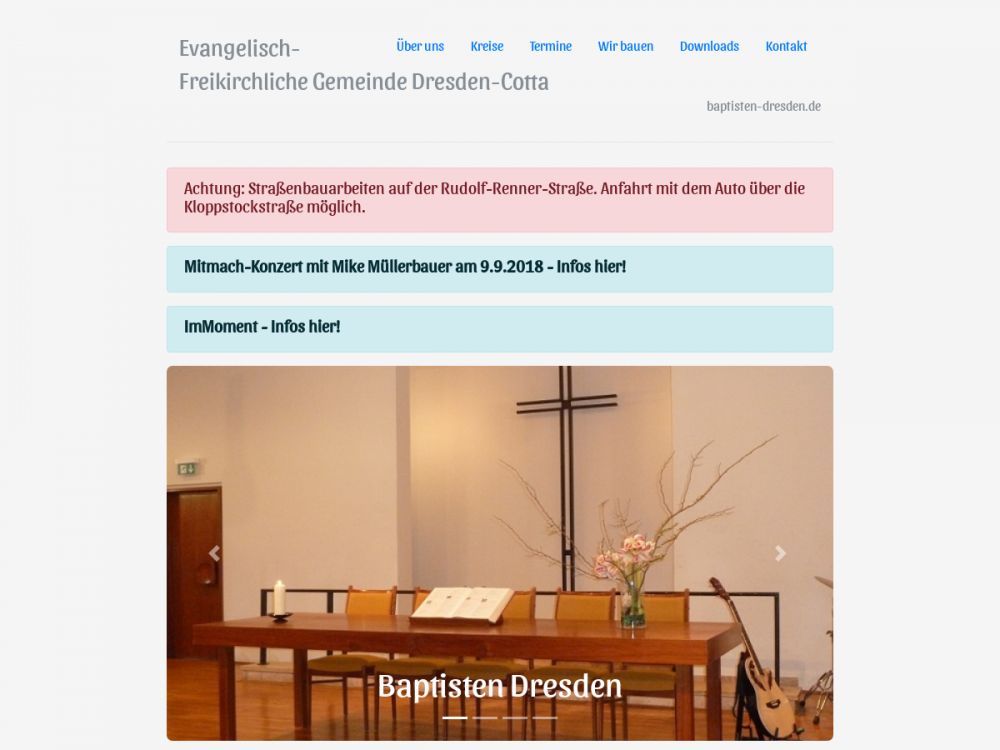 Wir verstehen uns als Raum zur Entfaltung des Lebens wie Gott es will. Wir laden zu einer persönlichen und vertrauensvollen Beziehung mit Jesus Christus ein. Als Baptistengemeinde sind wir Teil des Bundes Evangelisch-Freikirchlicher Gemeinden und engagieren uns darüber hinaus in der Ökumene, der Allianz und ganz konkret und praktisch in unserem Stadtteil Cotta. Ob beim Spielen im Krabbel- oder Mamitreff, Action in der Jungschar oder Jugend, beim Nachdenken über Gottes Wort in einem Hauskreis und Gebetstreffen für jedes Alter — jeder findet hier seinen Platz. Bands und Lobpreisgruppen gestalten einen Teil des Gottesdienstes und organisieren Lobpreisabende. Aber auch klassische Musik im Bläserkreis und Chor ist immer wieder zu hören. Wir sind eine bunte Mischung aller Generationen- und freuen uns über jeden, der uns kennenlernen möchte.Gemeinde-Info