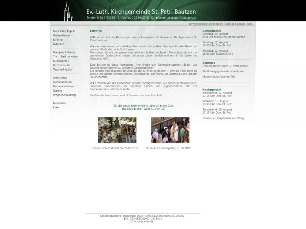 | Gottesdienst: | Sonntag 09.30 MMK, 10.30 Dom St. Petri, 18.00 Taucherkirche |