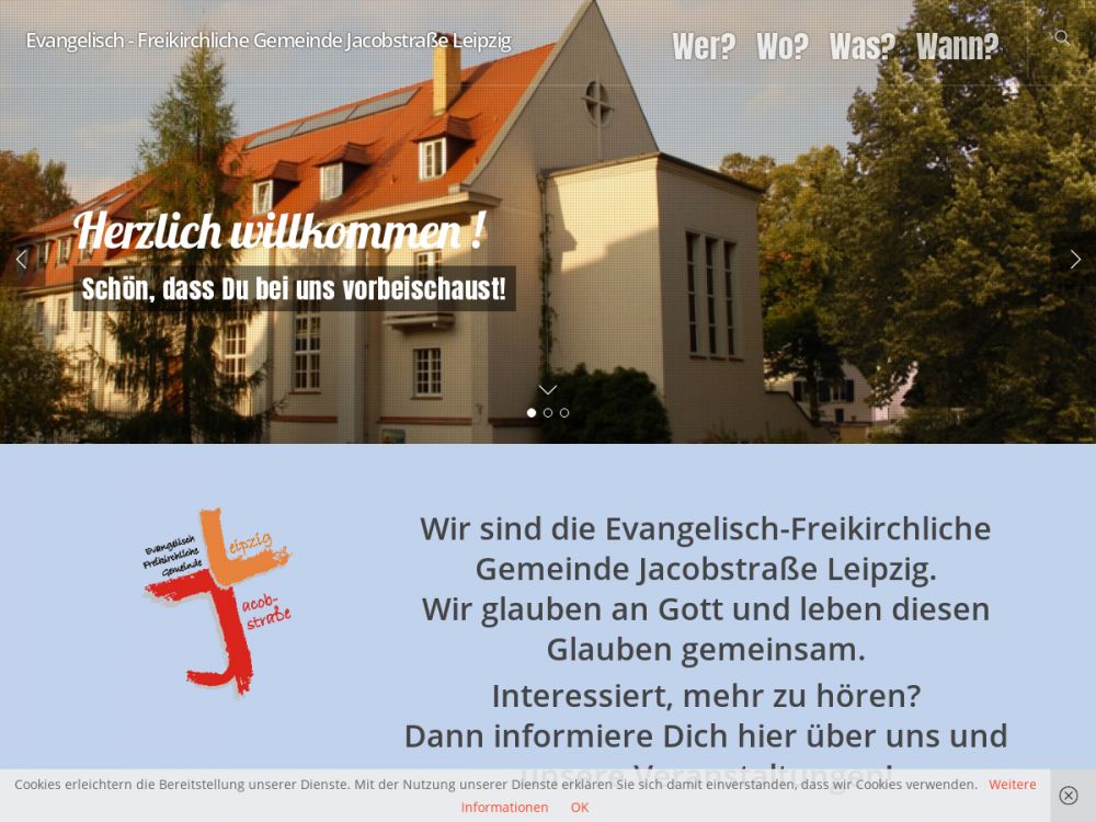 Wir sind die Evangelisch-Freikirchliche Gemeinde Jacobstraße Leipzig (Brüdergemeinde) im Bund Evangelisch-Freikirchlicher Gemeinden KdÖR. Wir - das sind Menschen, die an Jesus Christus glauben und sich von Gott geliebt und angenommen wissen. Unser Glaube an Jesus Christus hat den Charakter einer persönlichen Beziehung, die uns in unserem Lebensalltag begleitet. Diese Erfahrung möchten wir mit anderen teilen, darum stehen unsere Veranstaltungen jedem offen.Gemeinde-Info