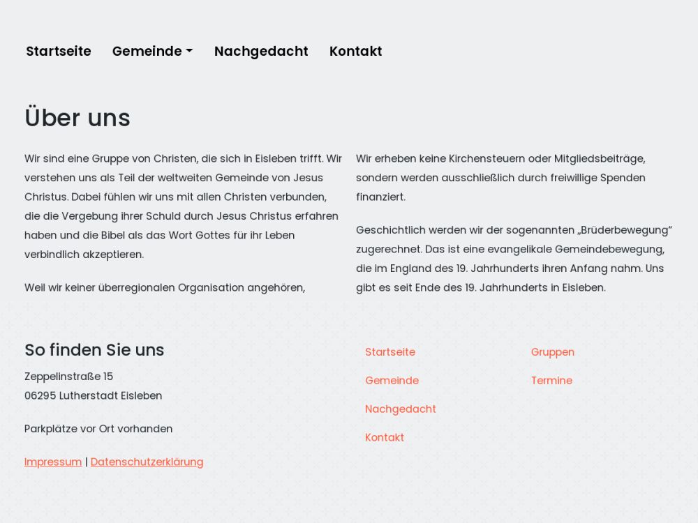 Wir sind Christen und glauben an Gott als den Schöpfer und daran, dass er die Menschen liebt. Die einzige Chance, zu ihm eine persönliche Beziehung zu bekommen, heißt Jesus Christus. Er starb stellvertretend für unsere Schuld, ist vom Tod auferstanden und wurde somit die Brücke zu Gott. Wir akzeptieren die Bibel mit allen ihren Aussagen als Autorität für unseren Glauben und unser Leben.Gemeinde-Info