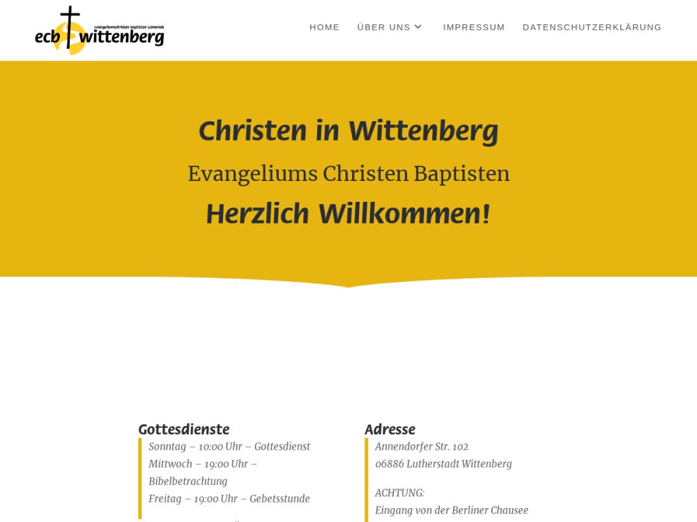 Wir sind Christen in der Lutherstadt Wittenberg. Jesus Christus steht für uns im Mittelpunkt unseres Lebens und somit auch das Wort Gottes – die Bibel. Seit ungefähr dem Jahr 2004 versammeln wir uns regelmäßig um die Bibel zu studieren, Gott anzubeten und Gemeinschaft als Christen zu haben.Die Bibel und biblische Predigten bilden den Hauptteil unserer Gottesdienste. Dazu singen wir zu Gottes Ehre und beten unseren Herrn und Heiland Jesus Christus an.