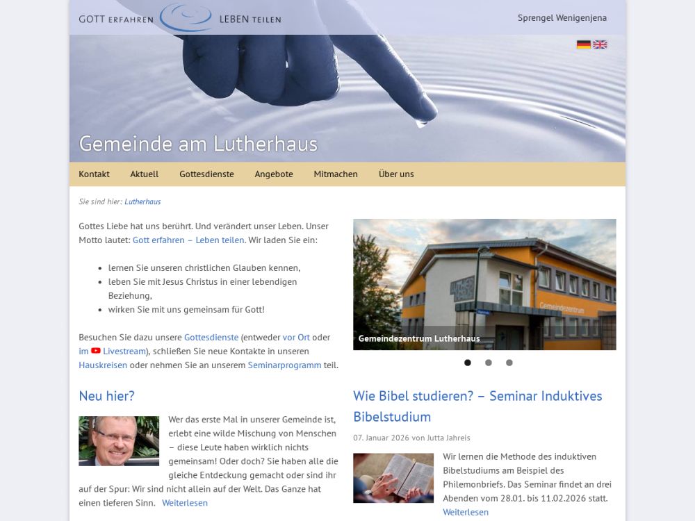 Gottes Liebe hat uns berührt. Und verändert unser Leben. Unser Motto lautet: Gott erfahren - Leben teilen.Das Lutherhaus ist eine offene, bunte und familienfreundliche Gemeinde im Zentrum von Jena mit einem breiten Spektrum von Leuten, moderner Musik und einem gut ausgebauten Kinderprogramm. Sonntagabends zum Aufwind-Gottesdienst kommen überwiegend Studenten und junge Erwachsene.