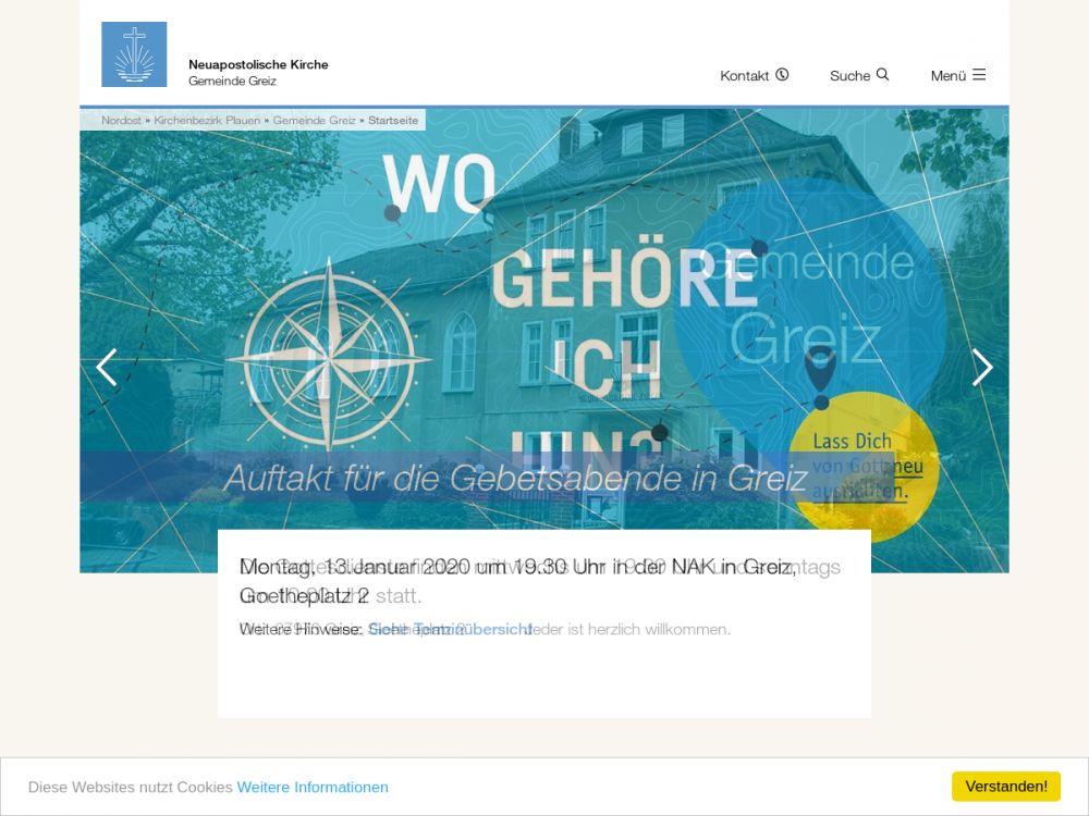 Herzlich willkommen auf dem Eintrag der Gemeinde Greiz der Neuapostolischen Kirche Nord-und Ostdeutschland. Wir geben Ihnen hier einen kleinen Einblick in unser aktives Gemeindeleben. Für Fragen zu unserem Glauben und unserer Gemeinde stehen wir Ihnen gerne zur Verfügung. Zu unseren Gottesdiensten und Zusammenkünften laden wir Sie herzlich ein.Gemeinde-Info