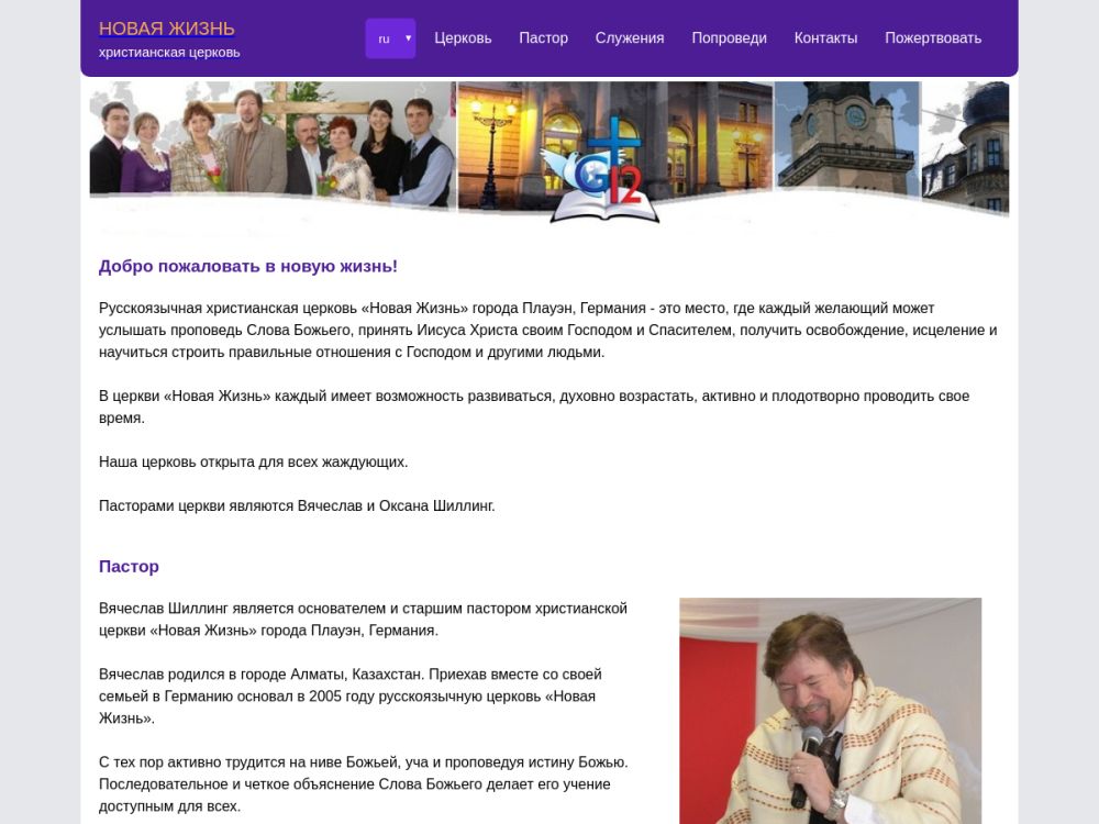 Christliche Pfingstliche freikirchliche Gemeinde "Neues Leben e.V." der Stadt Plauen wurde in Jahr 2005 gegründet und als eingetragener Verein rechtmäßig anerkannt.Pastoren der Gemeine "Neues Leben" sind Vjaceslav und Oxana Schilling.