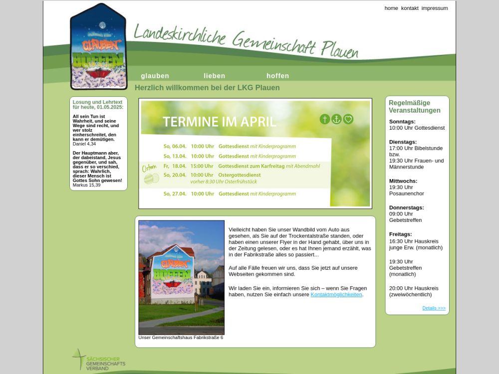 Die LKG Plauen ist eine starke Gemeinschaft von Christen, die miteinander, füreinander und für unsere Stadt glauben - hoffen - lieben.Mit unseren Veranstaltungen möchten wir einladen über Gott und die Welt nachzudenken. Deshalb gibt es bei uns Angebote für jedes Alter und für verschiedene Interessen. Wir orientieren uns an der Bibel und möchten füreinander und andere Menschen da sein.