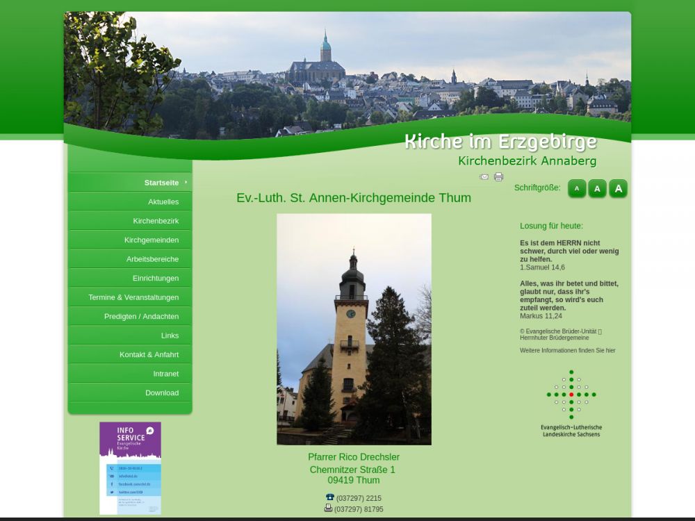 | Gottesdienst: | Jeden Sonntag abwechselnd in Thum oder Jahnsbach (siehe Website) |