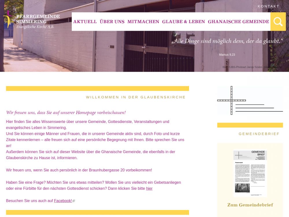 Offen, vorstädtisch, vielfältig – und ansonsten eine ganz normale Gemeinde, die Gottesdienst feiert, sich in verschiedenen Runden trifft, Kindern und Jugendlichen Raum bieten will und mit einem Besuchsdienst auch die vier Wände des Gemeindezentrums verlässt. So sieht sich die Evangelische Pfarrgemeinde A.B. Wien-Simmering.Vorstädtisch: Unsere Gemeinde hat 1.500 Mitglieder und umfasst das Gebiet des 11. Wiener Gemeindebezirks, der gut 105.000 EinwohnerInnen zählt (d.h. ca. 1,4 % der SimmeringerInnen sind evangelisch). Unsere Kirche, die Glaubenskirche, liegt im älteren Teil des Bezirks, fünf Gehminuten von der U3-Endstation Simmering entfernt. Im Osten dehnt sich unser Gemeindegebiet Richtung Schwechat bis zur Stadtgrenze aus.