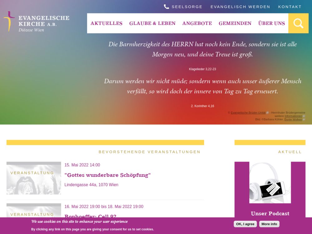 Eine christliche Glaubensgemeinschaft, offen, tolerant, mit Profil heißt Sie willkommen! Wir möchten eine einladende, offene Gemeinde sein. wir möchten Menschen in Beziehung zu Jesus Christus bringen. Wir möchten in Respekt und Liebe miteinander umgehen. Etwa 1400 Gemeindeglieder im Westen Wiens gehören zu uns. Predigt, Abendmahlsfeier, Gebet, Singen, Diakonie sind Mitte unserer geistlichen Gemeinschaft.Gemeinde-Info