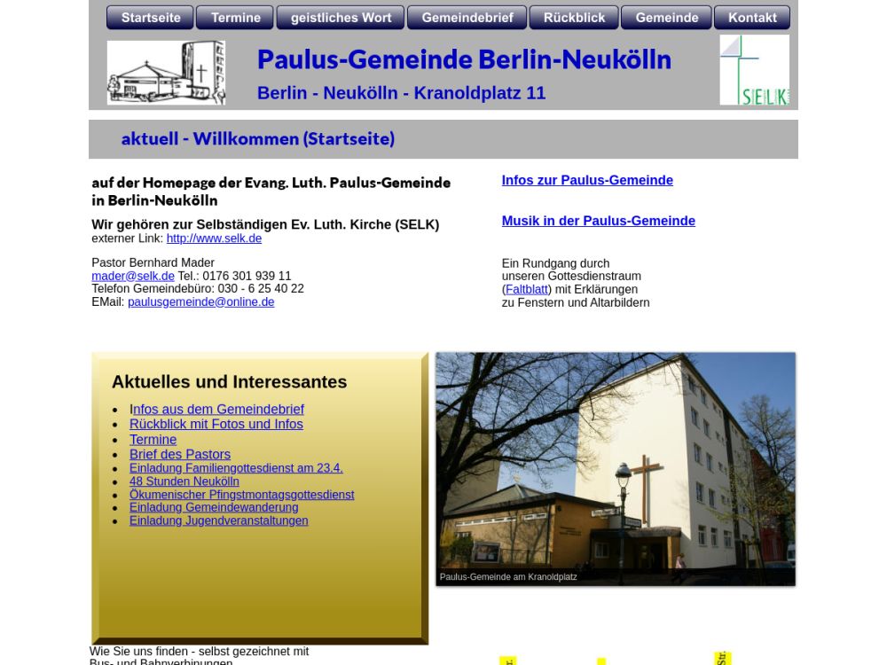Die evangelisch-lutherische Paulus-Gemeinde ist durch den Mauerbau entstanden. Evangelisch-lutherische Christen, die ihre Gemeinde im Zentrum der Stadt nicht mehr erreichen konnten, sammelten sich und gründeten eine neue Gemeinde. Der Gottesdienst steht im Zentrum des Gemeindelebens. Ihn ihm wird die Gnade Gottes, wie sie sich im Kommen, im Sterben und im Auferstehen des Sohnes Gottes, Jesus Christus, offenbart hat, verkündet, damit Jesus Christus als Heiland das Zentrum des Glaubens ist. Die Gemeinde freut sich an verschiedenen musikalischen und liturgischen Formen für das eine Große. Gäste und Neugierige sind herzlich willkommenGemeinde-Info