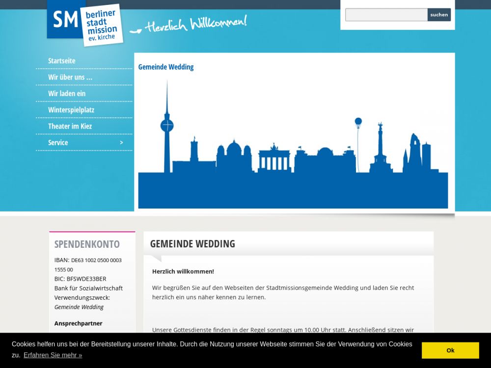 Die Gemeinde Wedding ist die zweitälteste Gemeinde der Berliner Stadtmission, einem freien Werk der Evangelischen Kirche Berlin-Brandenburg-Schlesische Oberlausitz (www.ekbo.de). Viele der Mitglieder sind in dieser Kirche aufgewachsen und prägen schon lange das Gemeindeleben, aber auch neuer Wind und junge Gesichter bereichern neben langjährigen, gefestigten Freundschaften unsere Kirche.Im Mittelpunkt unserer Gemeinde stehen diese wöchentlichen Gottesdienste, welche im Sommerhalbjahr in der durch große Fenster hell erleuchteten Kapelle im Hinterhof stattfinden, im Winterhalbjahr ist dort zwei mal in der Woche Winterspielplatz, weshalb der Gottesdienst während dieser Saison im Vorderhaus gefeiert wird.