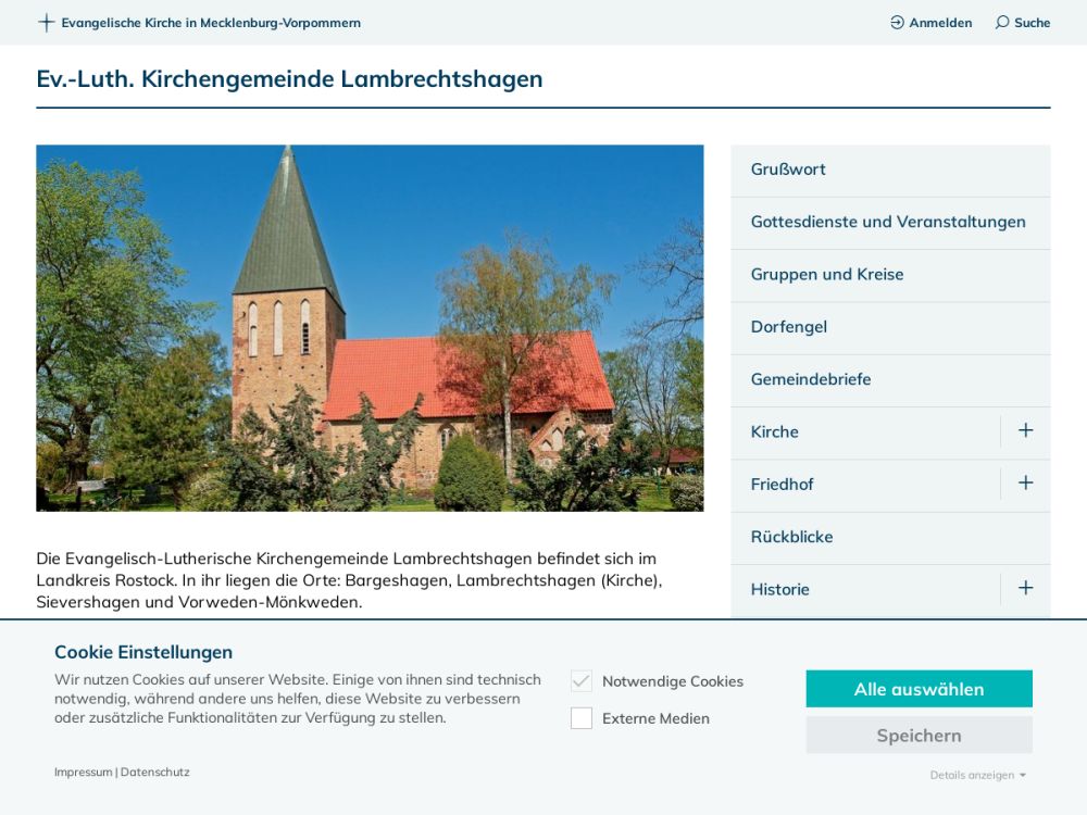 Die Kirchengemeinde Lambrechtshagen im Landkreis Rostock gehört zur Kirchenregion Bad Doberan in der Propstei Rostock. Diese ist ein Teil des Kirchenkreises Mecklenburg in der Evangelisch-Lutherischen Kirche in Norddeutschland. Unsere liebevoll renovierte Kirche stammt aus dem 13. Jahrhundert. Mitten im Dorf liegen die Kirche, der gepflegte Friedhof, der Pfarrhof mit der rekonstruierten Scheune, ein mit alten Obstbäumen bestandenes Parkgelände sowie ein zum Begegnungshaus umgebautes ehemaliges Stallgebäude.Gemeinde-Info