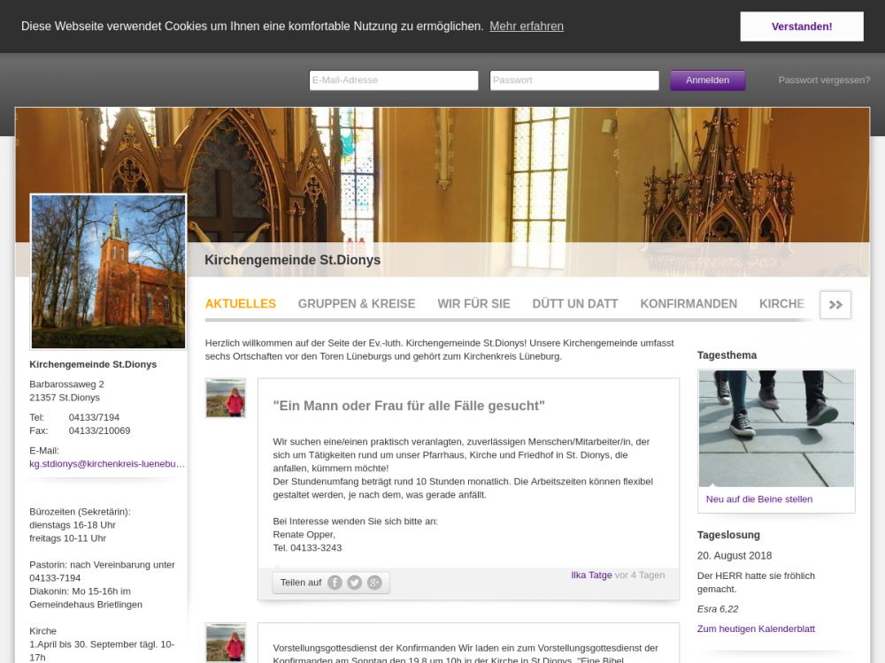 Hallo,die Ev.-Luth. Kirchengemeinde St. Dionys bietet Möglichkeiten sich zu treffen und gemeinsam den christlichen Glauben zu teilen. Es gibt Angebote für Kinder, Jugendliche und Erwachsene. Zur Gemeinde gehören die Orte Lüdershausen, Brietlingen, Barum, Horburg, Bütlingen und St. Dionys.