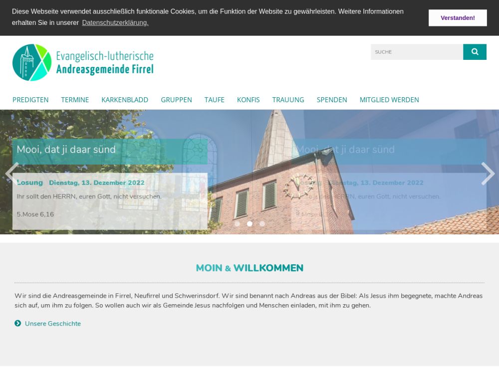 Wir sind die Andreasgemeinde in Firrel, Neufirrel und Schwerinsdorf. Wir sind benannt nach Andreas aus der Bibel: Als Jesus ihm begegnete, machte Andreas sich auf, um ihm zu folgen. So wollen auch wir als Gemeinde Jesus nachfolgen und Menschen einladen, mit ihm zu gehen.Gemeinde-Info