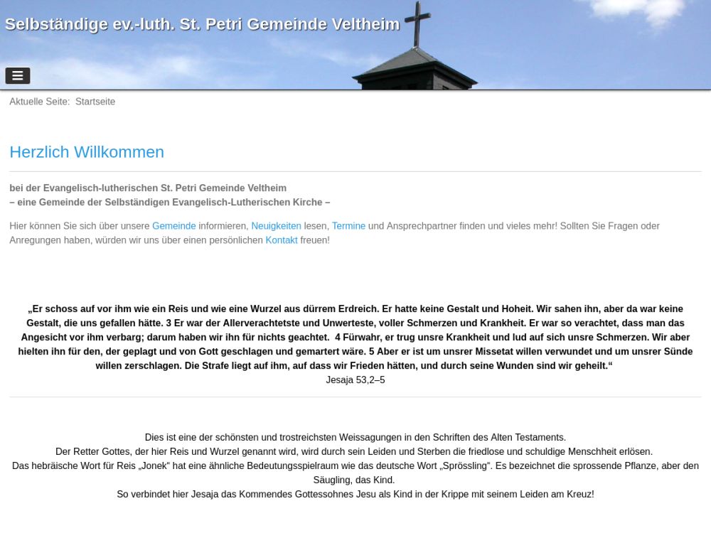 Unsere kleine St. Petri Kirche befindet sich in Veltheim oben auf dem Berg.Wir feiern unsere Gottesdienste in der Form der "Lutherischen Messe". In der Verkündigung (Predigt) hören wir Gottes Wort, empfangen den Zuspruch der Vergebung der Sünden (Absolution) unter Handauflegung in der Beichte und im Heiligen Abendmahl wird uns der wahre Leib und das wahre Blut Christi ausgeteilt und darin Vergebung, Leben und ewige Seligkeit geschenkt. Der Gottesdienst bildet darum das Zentrum und die Quelle, aus der alles andere in der Gemeinde - Gruppen und Kreise - entspringt.