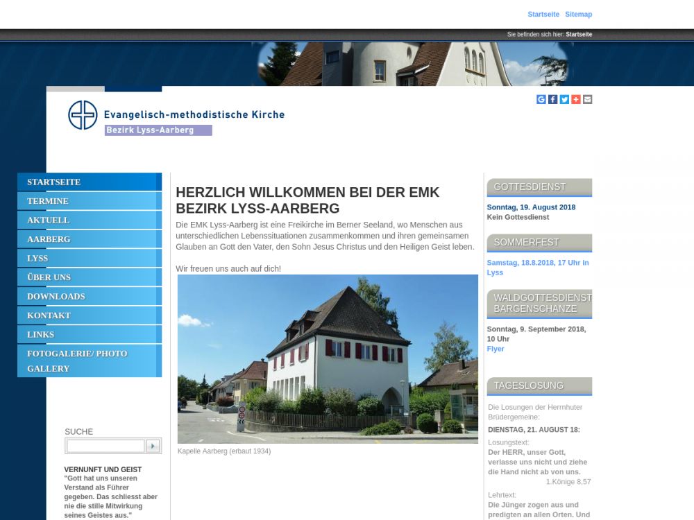 | Gottesdienst: | 1. und 3. Sonntag 10.00 Gottesdienst, 5. Sonntag abwechselnd in Aarberg und Lyss |