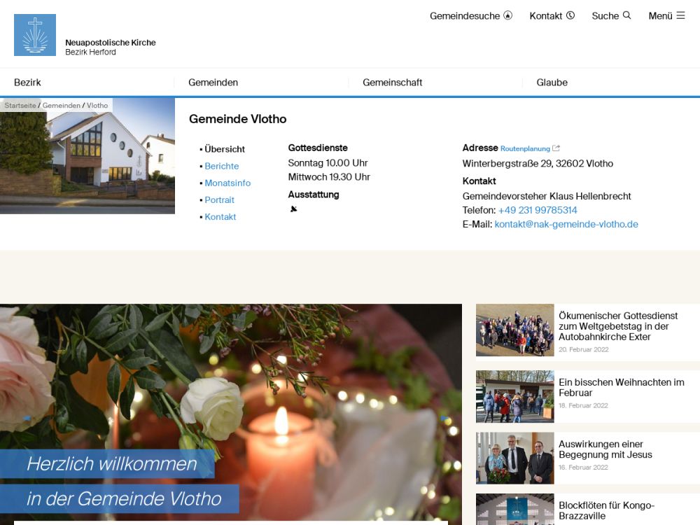 | Gottesdienst: | Sonntag 10:00 Uhr, Mittwoch 19:30 Uhr |
