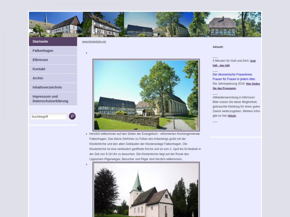 | Gottesdienst: | Sonntags 9:30 Uhr in der Klosterkirche in Falkenhagen/Sonntags 11 Uhr in der Dorfkirche in Elbrinxen im Wechsel |