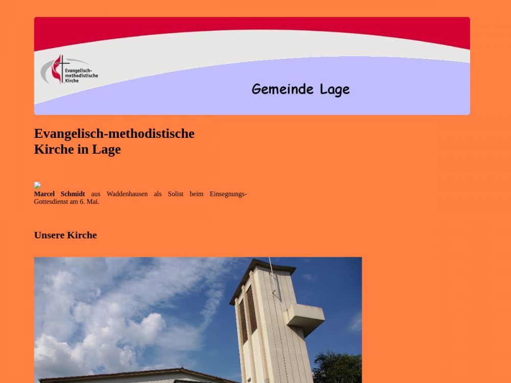Mitten in der Stadt steht neben der Hochbrücke gut erreichbar die Erlöserkirche der Ev.-methodistischen Kirche in Lage. Die Gemeinde lernt man schnell durch einen Gottesdienstbesuch am Sonntag kennen. Aber vielleicht suchen Sie für ihr Kind eine Mutter-Kind-Gruppe als Vorbereitung auf den Kindergarten oder möchten sich in der Flüchtlingsarbeit der Gemeinde engagieren. Die enge Zusammnenarbeit mit dre Ev.-lutherischen und der Ev.-reformierten Gemeinde in Lage hat zu verschiedenen gemeinsamen Projekten der Kirchen in der Stadt geführt. Seit vielen Jahren unterstützt der Cambine Arbeitskreis in Mozambique ein Bildungs- und Dorfentwicklungsprogramm und die Aufführung eines Musicals aus Kinder verschiedenster Gemeinden in Lage in der Woche nach Ostern setzt einen besonderen Höhepunkt im Kirchenkalender. Nahe bei den Menschen und hörend auf Gottes Gegenwart kennzeichnen die Gemeinde.Gemeinde-Info