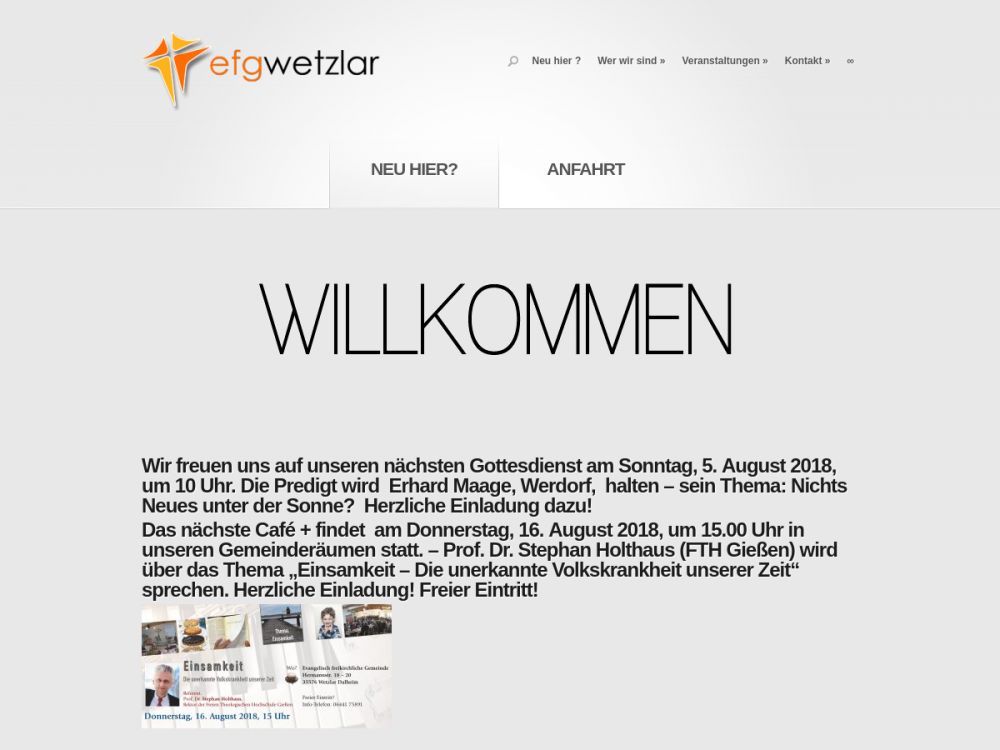 Wir sind Menschen, die an Jesus Christus glauben. In Ihm finden wir Sinn , Hoffnung und Glaubensgewissheit für unser Leben. Wir pflegen eine persönliche Beziehung zu Ihm.Unser Gemeindehaus ist das "Christliches Gemeindezentrum Wetzlar, Hermannstraße 18-20". Mit uns nutzen die Räumlichkeiten die russische 'Gemeinde "Wort der Errettung", Gottesdienst Sonntag um 13:00 Uhr in russisch/deutsch und der spanischen Gemeinde "Iglesia Hispanohablanee Wetzlar, Gottesdienst Samstag um 15:00 Uhr inspanisch/deutsch.
