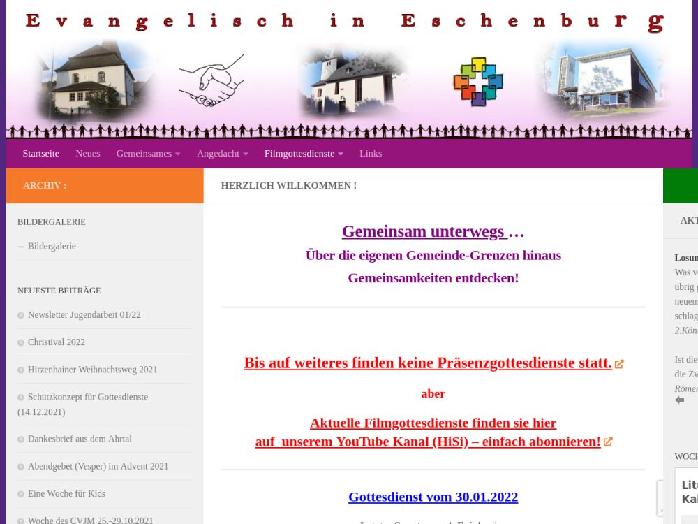 Die Evang. Kirchengemeinde Hirzenhain-Eschenburg ist eine Gemeinde im NBR Dietzhölztal-Eschenburg.Auf der Homepage können die aktuellen GD Zeiten & Orte abgerufen werden.