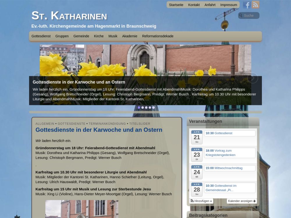 Wir sind eine evangelische Kirchengemeinde am Hagenmarkt, einem pulsierenden Verkehrsknotenpunkt im östlichen Teil der Braunschweiger Innenstadt. Wir pflegen vielfältige Kirchenmusik und lebendige Verkündigung. Ein wöchentliches Bildungsangebot "Mittwochnachmittag" (zusammen mit der Kirchengemeinde St. Magni) richtet sich mit einem abwechslungsreichen Programm an interessierte Menschen in der zweiten Lebenshälfte. In unseren Konfi-Treffs treffen sich Jugendliche in einer kleinen Gruppe und bereiten sich auf die Konfirmation vor. Wir pflegen Kontakte in unseren Stadtteil, insbesondere zur TU Braunschweig, der esg Braunschweig und arbeiten mit der Akademie Abt Jerusalem zusammen. Unser Pfarrer bietet Seelsorge in verschiedenen Lebenssituationen an (Kontaktaufnahme nach den Gottesdiensten oder per Mail).Ist Kirche eine Insel der Seligen? Wohl kaum. Dient Religion zum Abschalten vom Alltag? Ist Christsein ein Fluchtweg? Manchmal, ein bisschen. Aber auch mitten im Leben und in der Innenstadt sind Erfahrungen mit Gott möglich. Dafür muss man nicht weltfremd werden. St. Katharinen steht mittendrin. Am Hagenmarkt. Im Verkehr. Und damit in der Unruhe, bei gestressten Menschen, die hier unterwegs sind. Dieser Standort ist für uns ein Wink mit dem Kirchturm. Christ sein heiß: Da sein, wo das Leben pulsiert. Sich auf Gott gefasst machen, wo man normalerweise nicht mit ihm rechnet. Wir wollen uns vom Evangelium inspirieren lassen. Bei Jesus gilt: Fast nichts ist so, wie es auf den ersten Blick scheint. Die Berührung der Welt mit seiner Botschaft gibt viel zu denken. Und Grund zu feiern. Dafür haben wir in unserer Kirchengemeinde verschiedene Gelegenheiten, die allen Interessierten offenstehen. Wir möchten Menschen zusammenbringen, die das Unsichtbare im Sichtbaren aufstöbern wollen. Mit wachem Geist noch ein zweites Mal hinschauen. Nachdenken und vielleicht umdenken. Ins Gespräch kommen. Kultur genießen. Ein Stück Leben miteinander teilen. Und nicht zuletzt möchten wir ein aufmerksamer Partner im Stadtteil sein und hier etwas einbringen. Sie sind eingeladen.