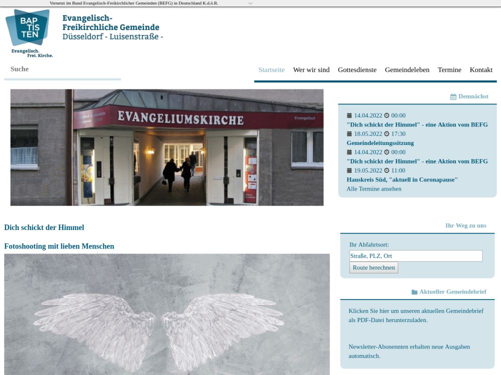 | Gottesdienst: | Sonntag 9:45 Uhr, bitte auf der Homepage im Kalender überprüfen, manchmal abweichende Zeiten |