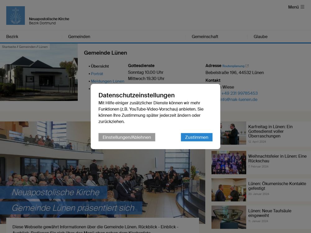 | Gottesdienst: | Karfreitag 10:00 Uhr, Ostern 10:00 Uhr, Sonntag 10:00 Uhr, Mittwoch 19:30 Uhr |