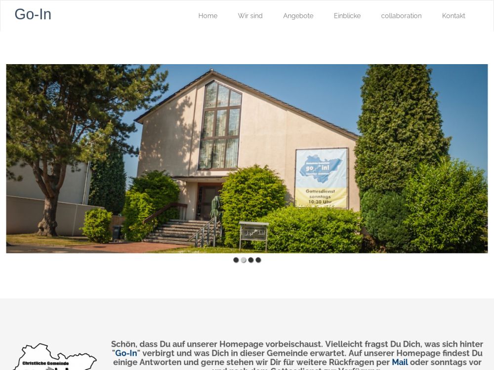 Wir sind eine Christliche Gemeinde mit familiärem Charakter. Wir verstehen uns als Teil der weltweiten Gemeinde Jesu Christi. Einem Dachverband gehören wir nicht an. Wir stehen auf dem Boden der Reformation und der evangelischen Allianz. "Go-In" darf als Einladung verstanden werden: Wir heißen Besucher willkommen, rüsten uns gegenseitig aus zum Dienst für unseren Herrn, den wir von Herzen anbeten. Unsere Jugendarbeit sind Pfadfinder in den Altersstufen Biber, Wölflinge und Pfadfinder.Gemeinde-Info