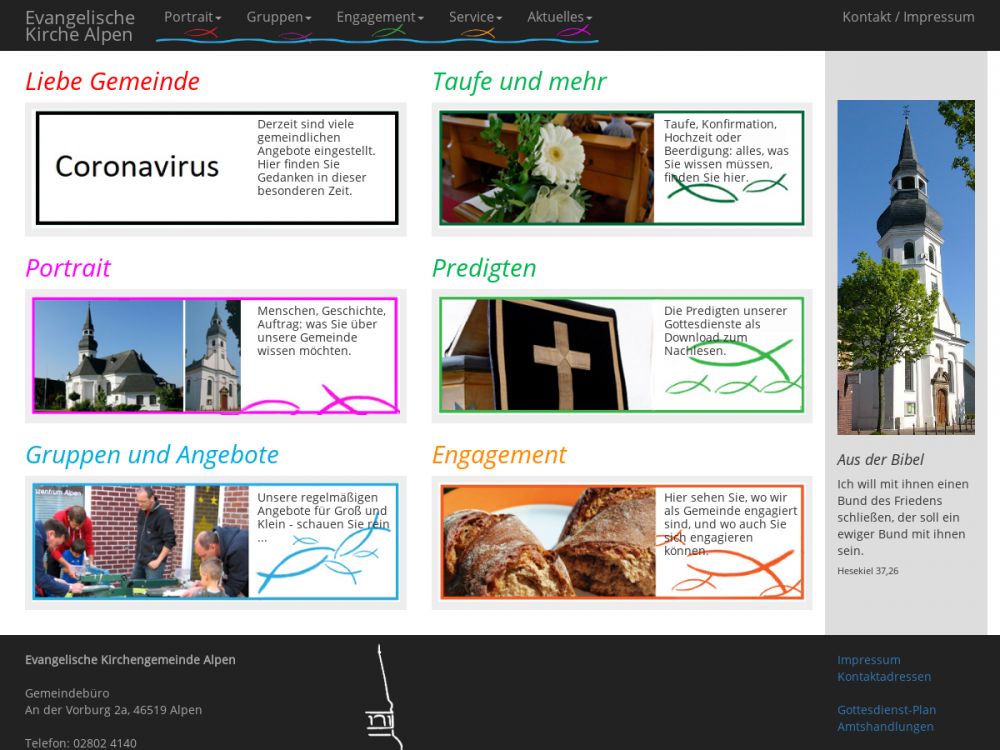 Die Kirchengemeinde Vluyn gehört zur Ev. Kirche im Rheinland zum Kirchenkreis Moers und hat ca 3900 Mitglieder. Das Gemeindeleben spielt sich vor allem in den zahlreichen Gruppen ab, die sich in den Gemeindehäusern in Alpen und Menzelen-Ost sowie in privaten Begegnungsstätten treffen. Darüber hinaus finden von Zeit zu Zeit besondere Veranstaltungen statt wie z.B. die Gesprächsreihe "Chancen des Alltags". Sie verknüpft aktuelle Themen mit der Frage, welche Antworten die Bibel geben kann. Viele Familien mit kleinen Kindern besuchen den "Krabbelgottesdienst", der alle drei Monate gefeiert wird.Gemeinde-Info