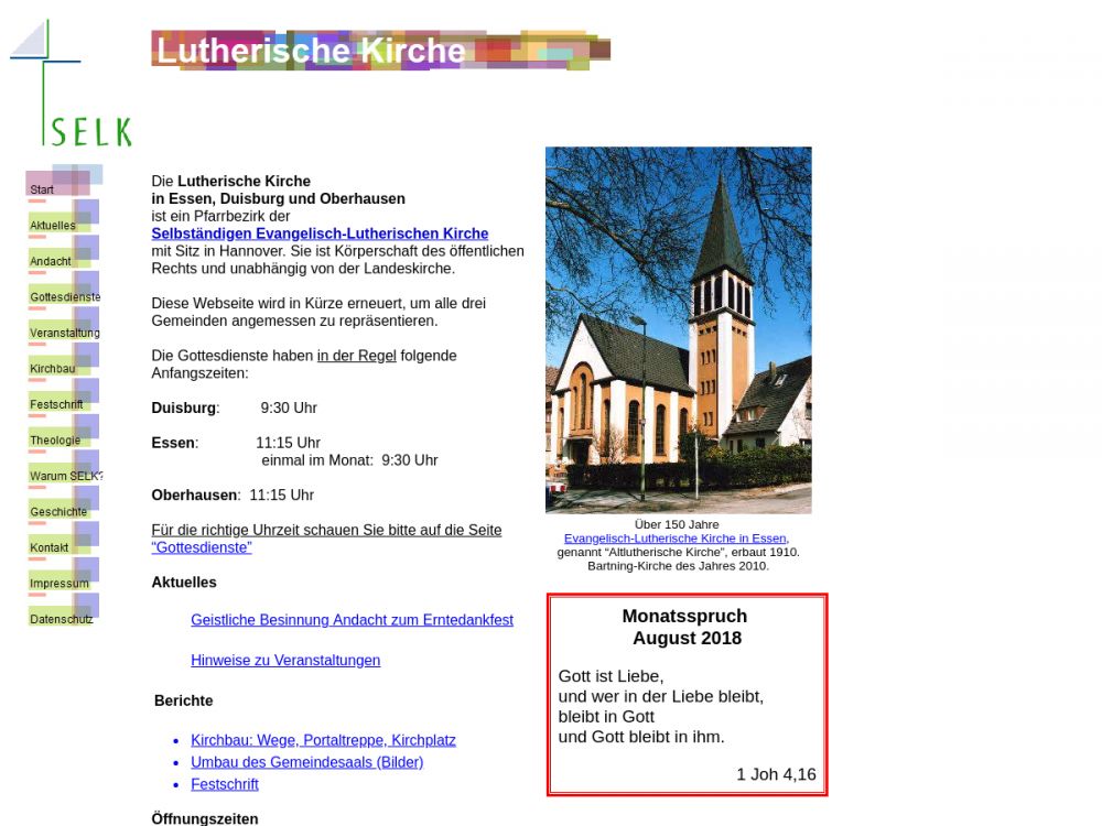 Die Ev.-Luth. Auferstehungsgemeinde Duisburg besteht seit 1891. Die Kirchenmusik hat bei uns einen hohen Stellenwert. Wir freuen uns, damit Gott die Ehre zu geben. Christen jeden Alters versammeln sich hier zu Gottesdiensten und Gesprächsgruppen. Die SELK arbeitet in der Arbeitsgemeinschaft Christlicher Kirchen (ACK) mit anderen christlichen Kirchen und Gemeinschaften zusammen und bringt ihr lutherisches Profil ein.Gemeinde-Info