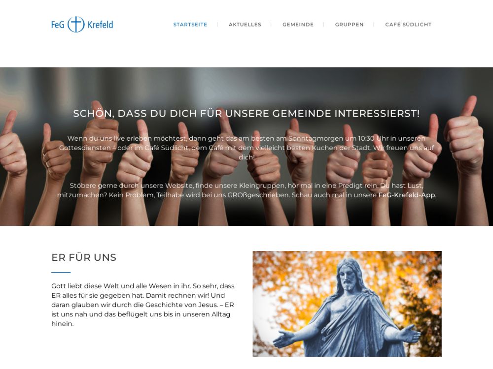 Unsere Gemeinde ist eine freikirchliche Gemeinde im Bund der Freien evangelischen Gemeinden FeG. In unseren Räumen finden auch Gottesdienste für Christen mit italienischer, russischer oder türkisch/bulgarischer Sprache statt.Nähere Infos gibt es in unserer FeG-Krefeld APP (fegkrefeld.communiapp.de) oder auf unserer Homepage (www.feg-krefeld.de)