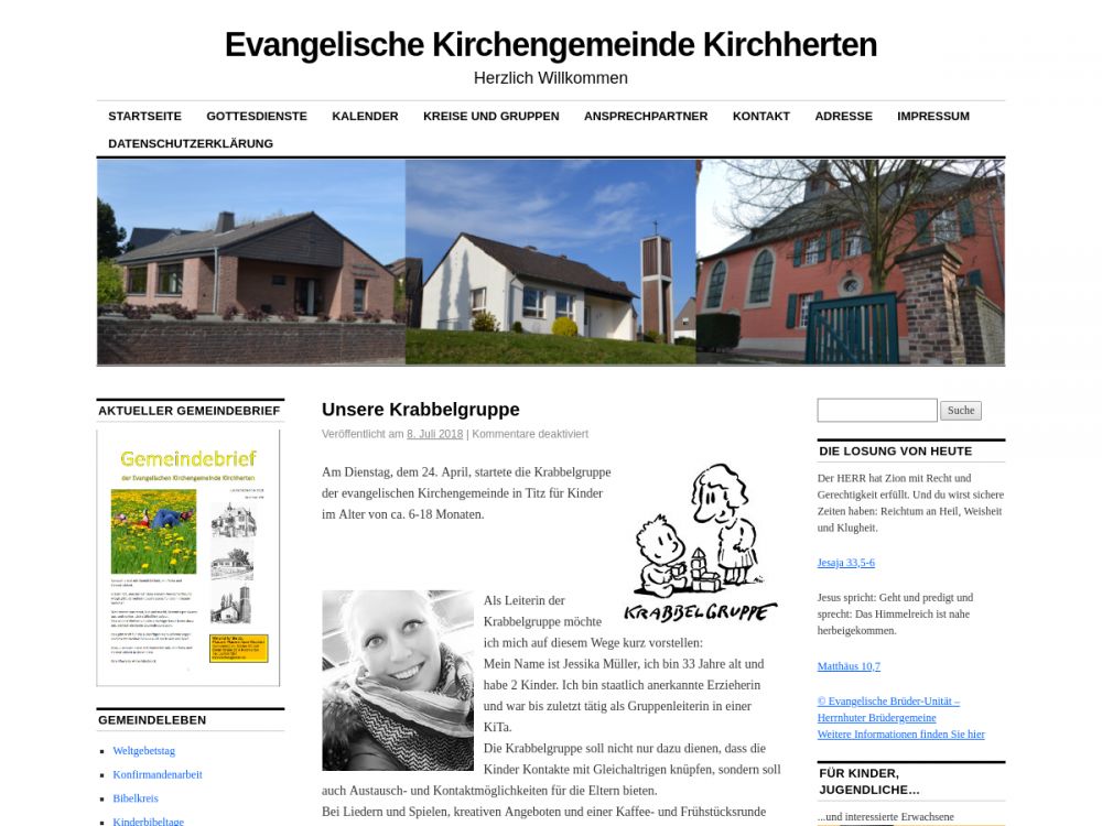 Unser Profil können Sie auf dem Internetauftritt der Gemeinde erkennen. Besuchen Sie uns unter: http://www.evangelisch-kirchherten.de/. Beachten Sie bitte, dass die Gottesdienste und die Kindergottesdienste nach dem veröffentlichten Plan in den entsprechenden Orten stattfinden! Nicht jeden Sonntag findet an jedem Ort zur gleichen Zeit ein Gottesdienst statt. Weiter unten können Sie unsere Internetpräsenz durch einen Klick auf den Link auch direkt erreichen.Gemeinde-Info