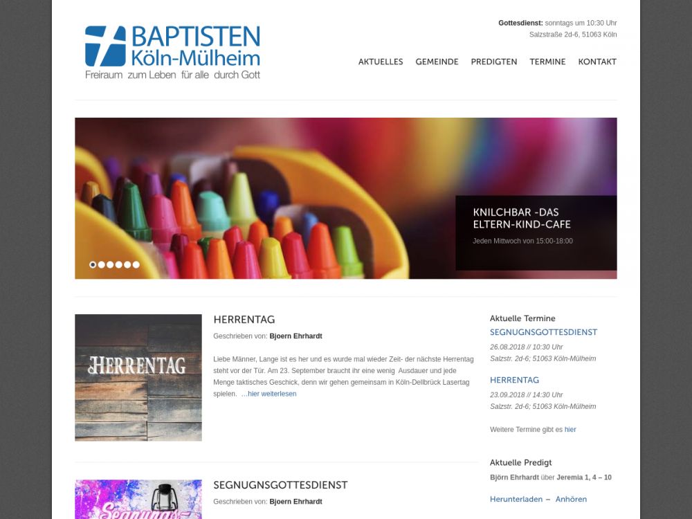 Ein „Freiraum zum Leben für alle durch Gott„, das möchten wir als Gemeinde sein. Deshalb ist uns jeder Mensch willkommen!Jeder Mensch – das ist eine unglaublich kreative Vielfalt, die sich auch in unserem Gemeindeleben widerspiegelt. Dabei ist unser gemeinsamer Gottesdienst ein wichtiges Element. Den Sonntagvormittag miteinander zu verbringen, bedeutet für uns sich Zeit zu nehmen, Gott auf ganz unterschiedliche Art und Weise zu begegnen, es zu genießen, bekannte und neue Menschen zu treffen und Kontakte zu pflegen. Sei es bei einer Tasse Kaffee in unserem Foyer, beim regelmäßigen gemeinsamen Mittagessen, beim Picknicken am Rhein oder bei einem Gespräch in unserer “ansprech-bar”. Als Gemeinde ist es uns wichtig, Leben miteinander zu teilen und unseren Glauben gemeinsam zu gestalten. Das geschieht als gesamte Gemeinde, in Projektgruppen und Seminaren oder – etwas privater – in Kleingruppen und Hauskreisen. Wir verstehen uns dabei als Gemeinde für alle Generationen. Das spiegelt sich nicht nur in unserem Gottesdienst wieder sondern ebenso in unseren Gruppenangeboten, die von Kindergruppen bis hin zu regelmäßigen Seniorennachmittagen ganz unterschiedliche Bedürfnisse abdecken.