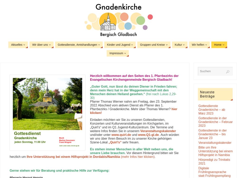 1. Pfarrbezirk / Stadtmitte, Rommerscheid, Sand, Herrenstrunden / Gnadenkirche, Kita Quirl, Spieleverleih, Q1 Jugend-Kulturzentrum, "Quirl's", "Engel am Dom", Mobiler Sozialer Dienst, Ambulante Krankenpflege, Ev. Krankenhaus, Psychiatrie, Seniorenheime Quirlsberg, Hospiz "Die Brücke", FriedhofGemeinde-Info