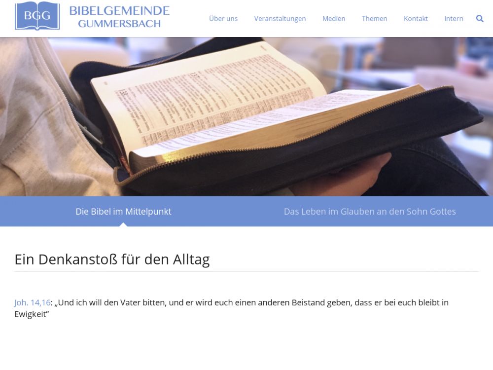 Wir sind eine Gemeinschaft von Christen, die die Bibel – das Wort Gottes – in den Mittelpunkt ihres Lebens stellen. Deshalb nennen wir uns Bibelgemeinde. Sie finden uns im Zentrum der oberbergischen Kreisstadt Gummersbach.Wir vertrauen uns im Glauben Jesus Christus an, weil wir nur durch Ihn den Frieden mit Gott und neues Leben haben. Folglich möchten wir uns von Gottes ewig gültigem Wort in unserer Denkweise prägen lassen und nehmen es zur Grundlage unseres Handelns. Wir möchten Gott die Ehre geben, indem wir in allem im Gehorsam gegenüber Seinem Willen leben.