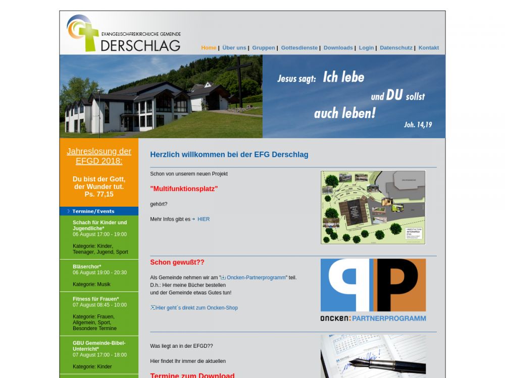 EFG Derschlag - Zuhause. Bei Gott und Menschen.Diese "Mission" ist unser Leitbild. Menschen jeden Alters und jeder Herkunft sollen bei uns ein "Zuhause" finden. Ein Zuhause in der Gemeinschaft mit anderen Menschen, aber vor allem ein Zuhause bei Gott. Ein Leben in Versöhnung mit dem, der uns geschaffen und seinen Sohn für uns geopfert (Johannes 3, 16) hat, damit wir trotz all unserer Fehler (Sünden) mit ihm Gemeinschaft haben können.