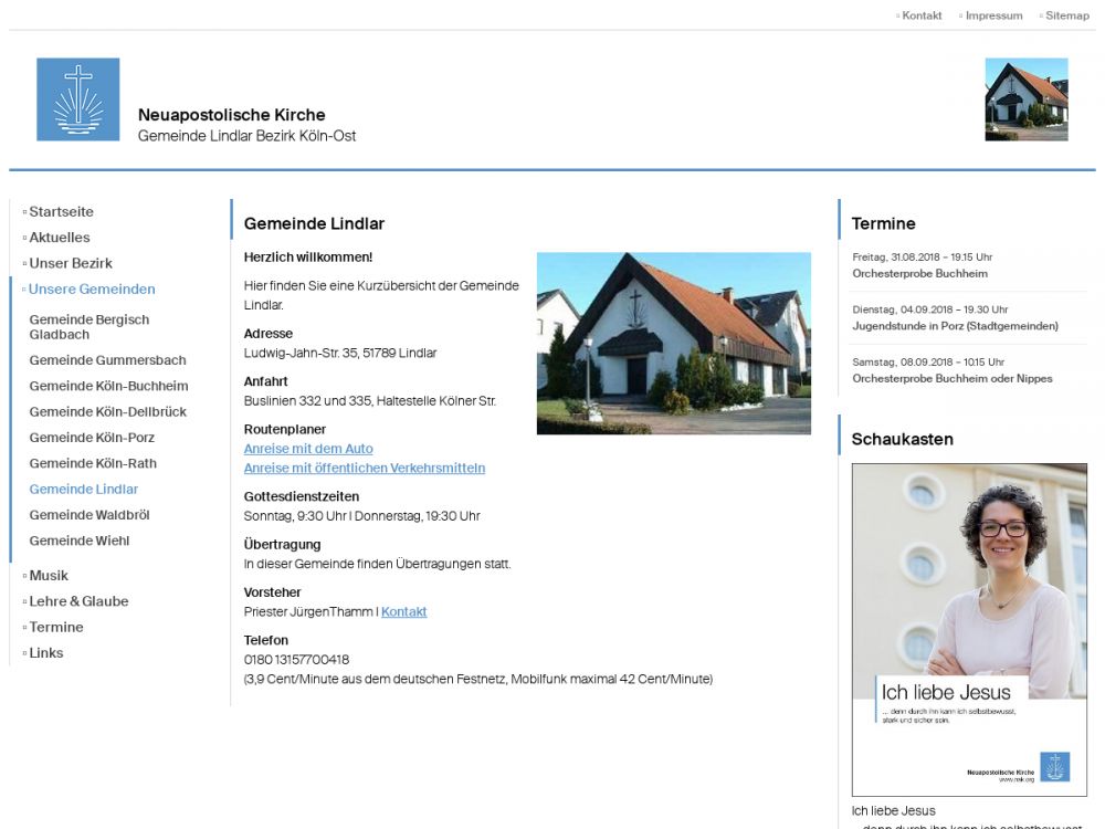| Gottesdienst: | Sonntag, 10:00 Uhr & Donnerstag, 19:30 Uhr |