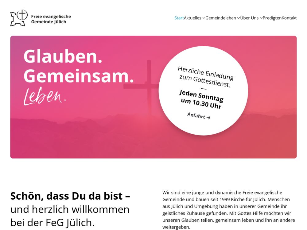 Wir sind eine junge und dynamische Freie evangelische Gemeinde und bauen seit 1999 Kirche für Jülich. Menschen aus Jülich und Umgebung haben in unserer Gemeinde ihr geistliches Zuhause gefunden. Mit Gottes Hilfe möchten wir unseren Glauben teilen, gemeinsam leben und ihn an andere weitergeben.Gemeinde-Info