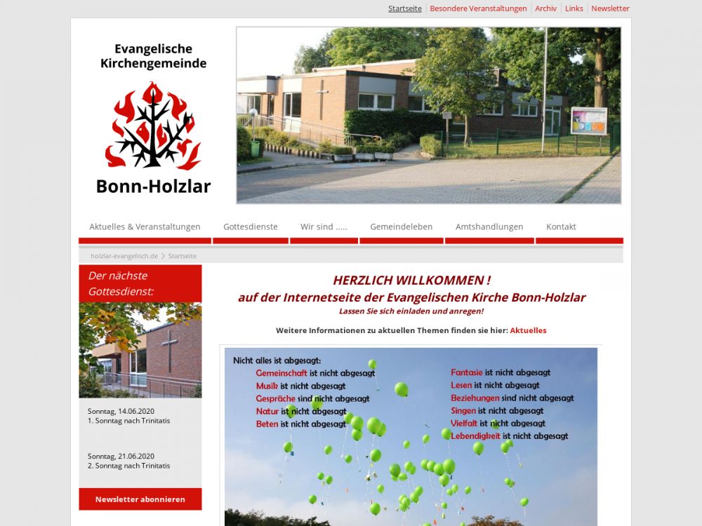 Die Evangelische Kirchengemeinde Bonn-Holzlar mit etwa 2.300 Gemeindemitgliedern liegt im rechtsrheinischen Stadtteil Beuel der Bundesstadt Bonn am Naherholungsgebiet Ennert. Unser Gemeindezentrum verfügt mit der Dornbuschkirche über einen Gottesdienstraum (rd. 250 Plätze), mehrere Gruppenräume, ein Pfarr- und Gemeindebüro sowie eine Kindertageseinrichtung.Wir sind eine lebendige Gemeinde mit einem reichen kirchenmusikalischen Leben (Kinder- und Jugendchöre sowie einem gemeinsamen Kirchenchor mit der Evangelischen Kirchengemeinde St. Augustin und Hangelar).
