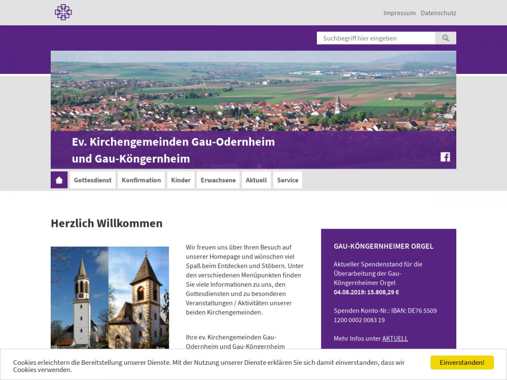 | Gottesdienst: | Gau-Odernheim: Sonntags 10.00 Uhr; Gau-Köngernheim: Sonntags 9.00 Uhr / Samstags 18.00 Uhr im 14-tg. Wechsel |