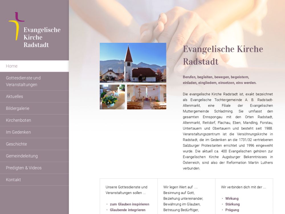 Wir sind eine Tochtergemeinde der evang. Pfarrgemeinde A.B. Schladming im salzburgischen Enns-Pongau. Die Tochtergemeinde wurde 1988 gegründet, die Gottesdienste feiern wir seit 1996 in der neu erbauten Versöhnungskirche in Radstadt.Gemeinde-Info