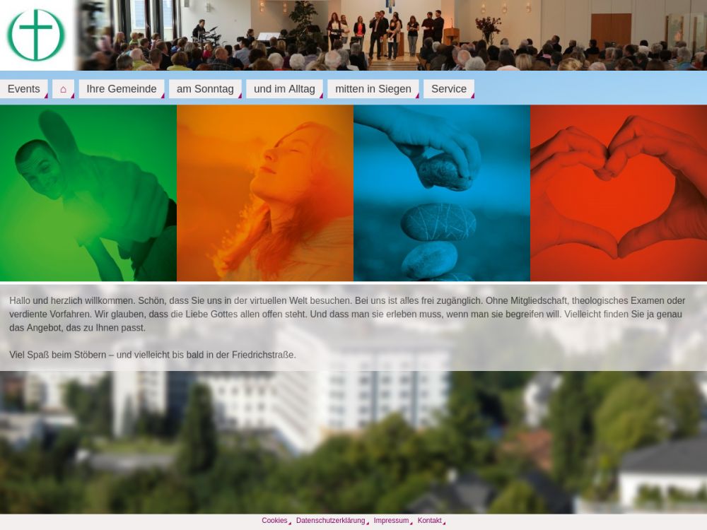 Im Zentrum Siegens liegt unser Gemeindezentrum, das jede Woche als Treffpunkt für Jung und Alt dient. Die Gemeinde gibt es seit 1882 und hat zur Zeit gut 270 Mitglieder. Gemeinsam möchten wir füreinander da sein, uns im Glauben stärken und Gott die Ehre geben. Regelmäßig finden Angebote für Kinder, Jugendliche und Erwachsene, Senioren, Frauen und Männer statt. Unser Gottesdienst beginnt jeden Sonntag um 10 Uhr. Herzliche Einladung!Gemeinde-Info