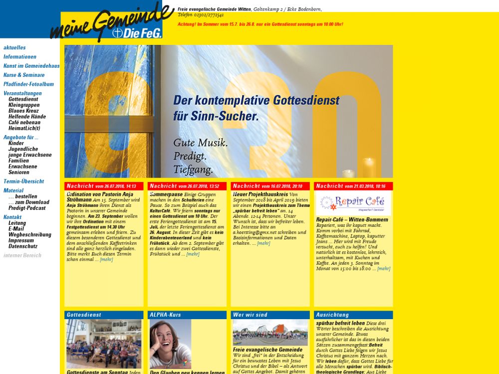 Die Freie evangelische Gemeinde Witten ist – wie 500 weitere – unabhängig von Staat und Steuern. Die Gemeindearbeit wird durch freiwillige Spenden von Mitgliedern und Freunden und deren ehrenamtlichem Engagement getragen. Die Gemeinden, kurz „FeG“, bestehen aus Christen, die an Jesus Christus glauben, weil sie in ihm Gott, dem liebevollen Schöpfer dieser Welt und ihres Lebens, begegnet sind. Sie haben erfahren, dass diese Liebe vorbehaltlos ist und ihnen persönlich gilt.Wenn Sie neugierig geworden sind und die Freie evangelische Gemeinde kennen lernen möchten, sind Sie herzlich eingeladen. Das Gemeindezentrum finden Sie in Bommern, direkt an der „Hauptstraße“ Bodenborn, Ecke Goltenkamp.