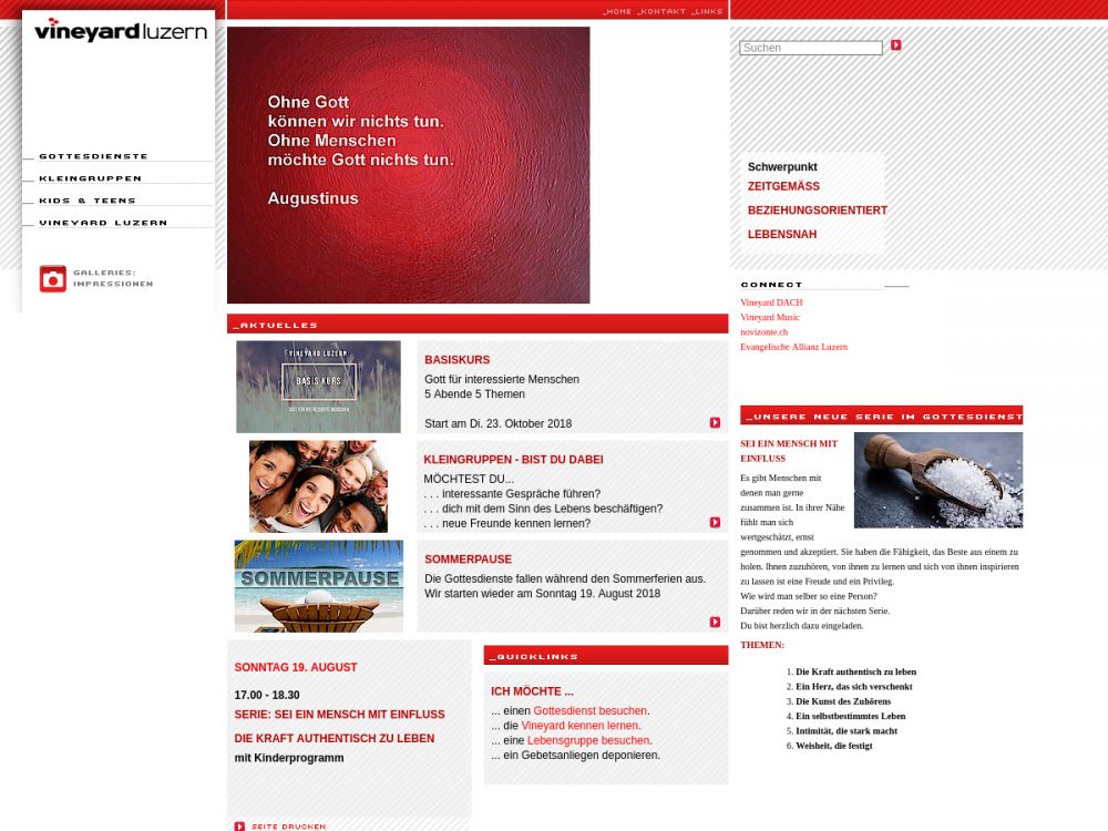 Die Vineyard Luzern gehört zur Vineyardbewegung. Sie ist in den 1970er Jahren in den USA entstanden und hat in der Zwischenzeit weltweit Fuss gefasst. Wir gehen davon aus, dass Gott heilt, Blockaden löst, neue Perspektive schenkt und Versöhnung schafft. Deshalb ist es unser Ziel, eine Atmosphäre zu schaffen, die solche Prozesse begünstigt, und ein zeitgemässes, beziehungsorientiertes und lebensnahes Christsein zu leben.Gemeinde-Info