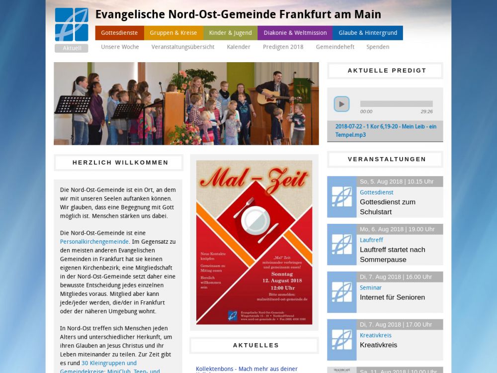 Die Evangelische Nord-Ost-Gemeinde wurde 1887 gegründet, gehört zur Evangelischen Landeskirche Hessen-Nassau (EKHN) und ist eine so genannte Personalkirchengemeinde“. Im Gegensatz zu den meisten anderen Evangelischen Gemeinden in Frankfurt hat sie keinen eigenen Kirchenbezirk; eine Mitgliedschaft in der Nord-Ost-Gemeinde setzt daher eine bewusste Entscheidung jedes einzelnen Mitgliedes voraus. Mitglied aber kann jede/jeder werden, die/der in Frankfurt oder der näheren Umgebung wohnt.In Nord-Ost treffen sich Menschen jeden Alters und unter-schiedlicher Herkunft, um ihren Glauben an Jesus Christus und ihr Leben miteinander zu teilen.