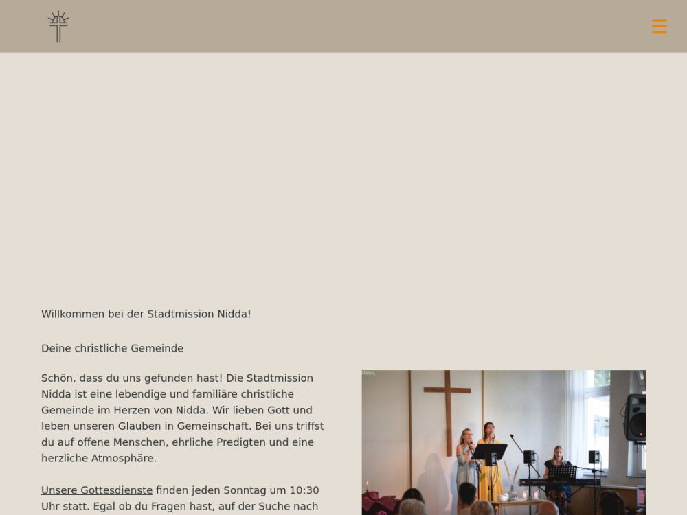 Wir sind die Stadtmission Nidda, eine lebendige und familiäre christliche Gemeinde im Herzen von Nidda. Wir lieben Gott und leben unseren Glauben in Gemeinschaft. Bei uns triffst du auf offene Menschen, ehrliche Predigten und eine herzliche Atmosphäre. Wir gehören zum C1 evangelischer Gemeindebund.Unsere Gottesdienste finden jeden Sonntag um 10:30 Uhr statt. Egal ob du Fragen hast, auf der Suche nach Gott bist oder einfach christliche Gemeinschaft erleben möchtest – bei uns bist du genau richtig.