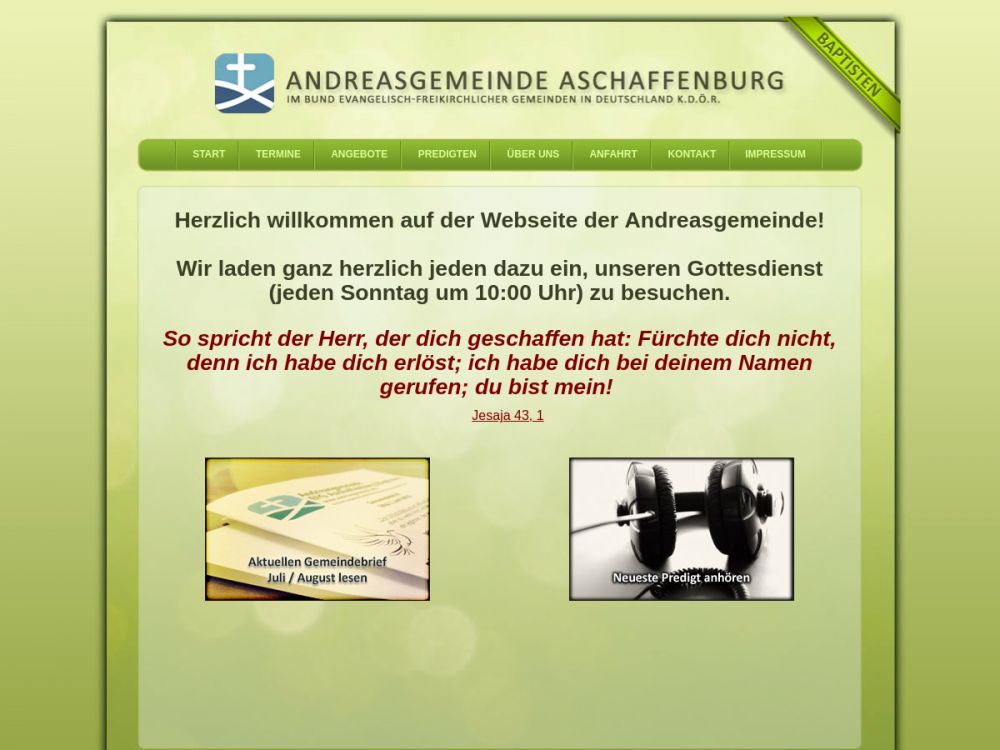 Die Andreasgemeinde (Evangelisch-Freikirchliche Gemeinde, Baptisten) ist eine christliche Gemeinde in und für Aschaffenburg. Wir wollen Menschen im Raum Aschaffenburg zum Leben mit Gott ermutigen.