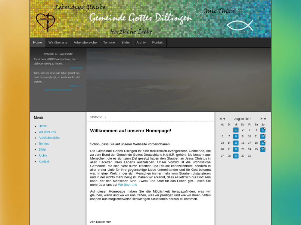 Die Gemeinde Gottes Dillingen ist eine freikirchlich-evangelische Gemeinde, die zu dem Bund der Gemeinde Gottes Deutschland K.d.ö.R. gehört. Sie besteht aus Menschen, die es sich zum Ziel gesetzt haben den Glauben an Jesus Christus in allen Facetten ihres Lebens auszuleben. Unser Vorbild ist die urchristliche Gemeinde, die sich nicht durch Tradition und Rituale kennzeichnete, sondern in aller erster Linie für ihre gegenseitige Liebe untereinander und für Gott bekannt war. In einer Welt, in der sich Menschen immer mehr vom Glauben distanzieren und in der nichts mehr heilig ist, haben wir erkannt, dass es letztlich nur Gott sein kann, der den Menschen Sinn, Zweck und Kraft für das Leben gibt.Gemeinde-Info