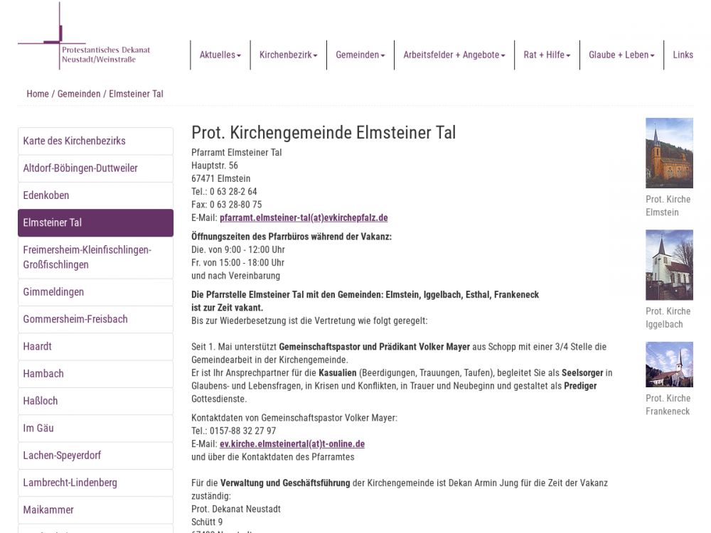 | Gottesdienst: | sonntags etwa 14tägig in Iggelbach und Elmstein (9 und 10.15 h), monatlich um 10 h in Frankeneck |